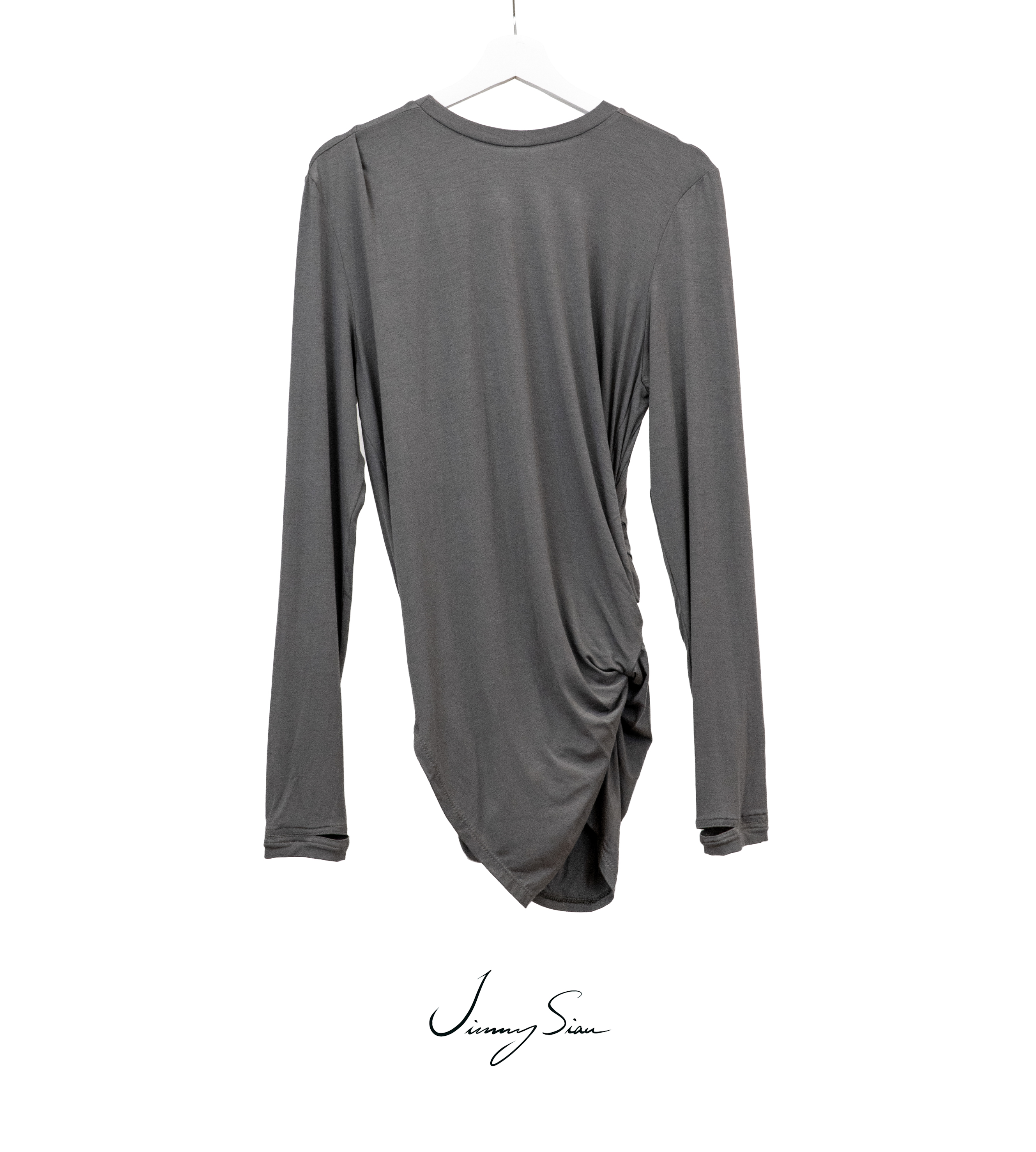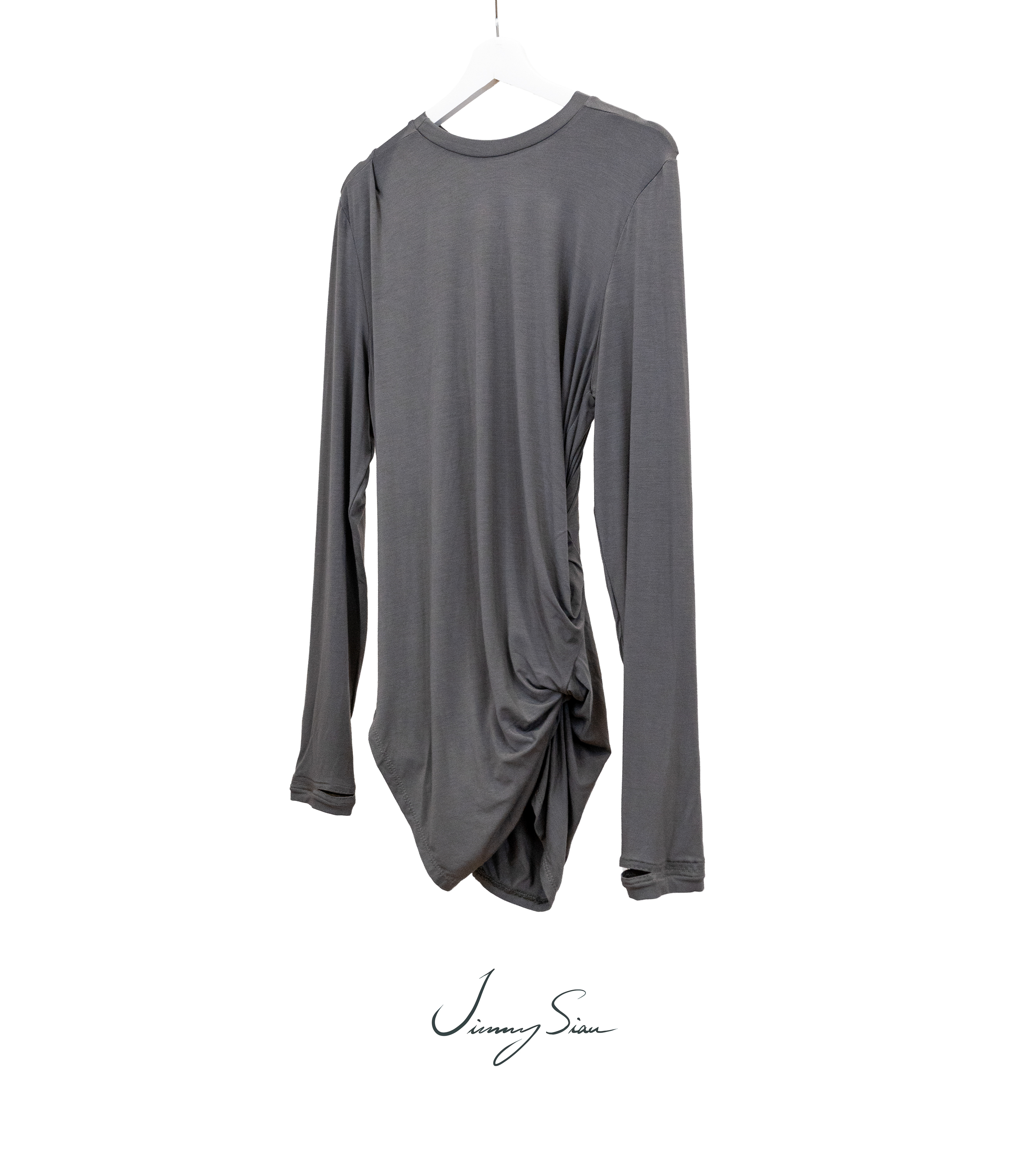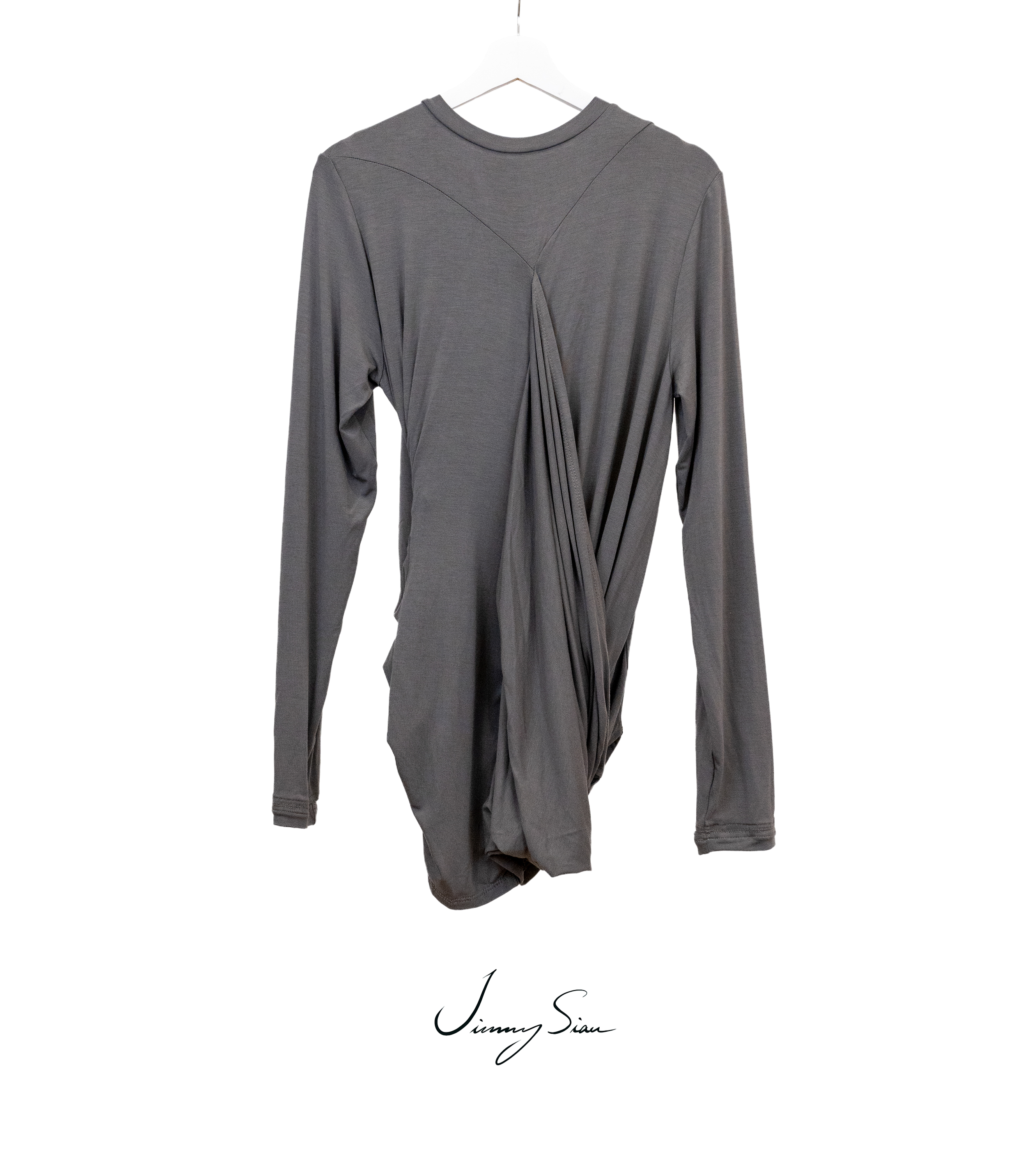 This aw22 hand-draped long-sleeved T-shirt is below hip length. It has a round neck and thumb holes. It features an asymmetric drape running diagonally across the body from the shoulder to the hip and up the back.