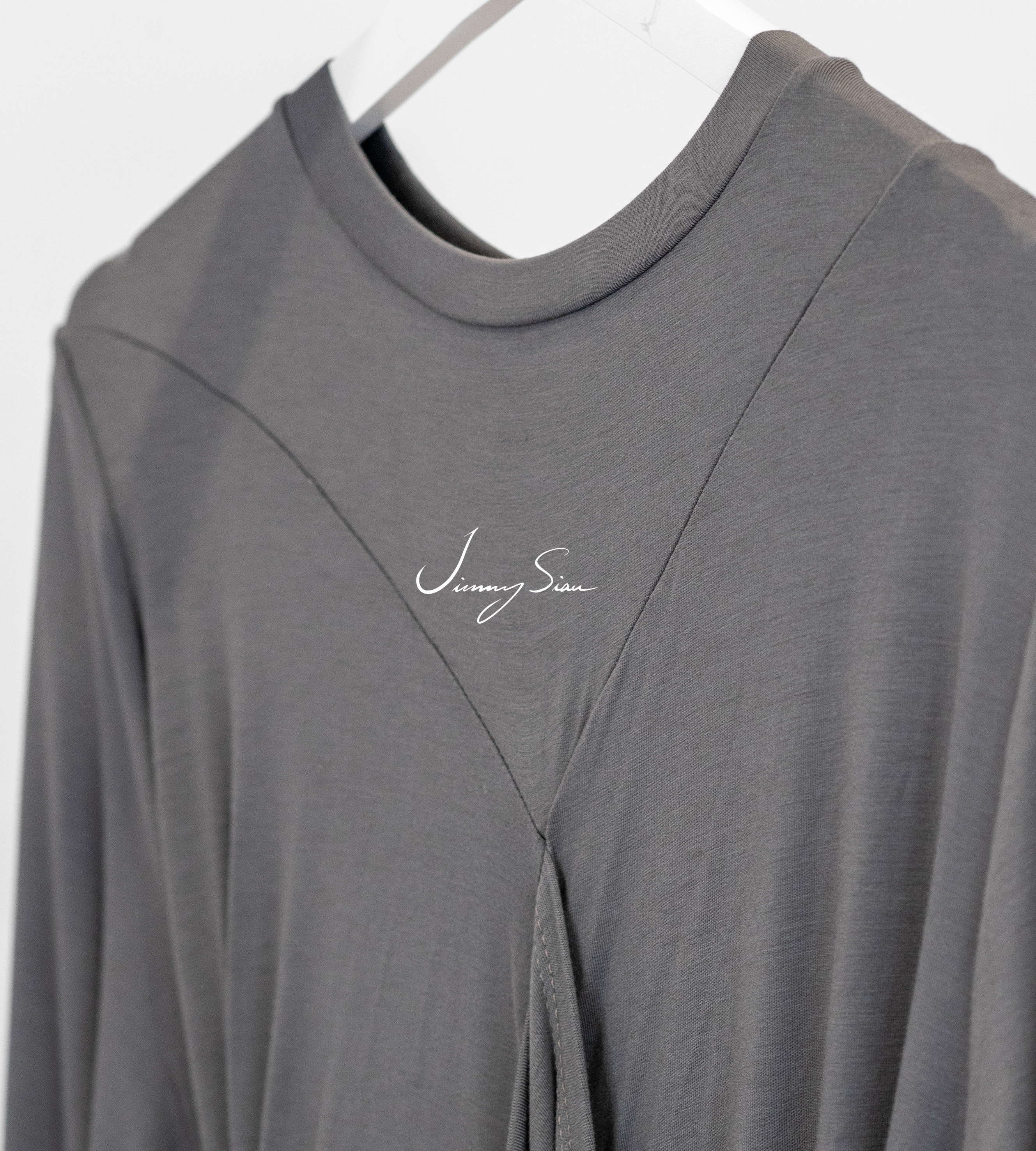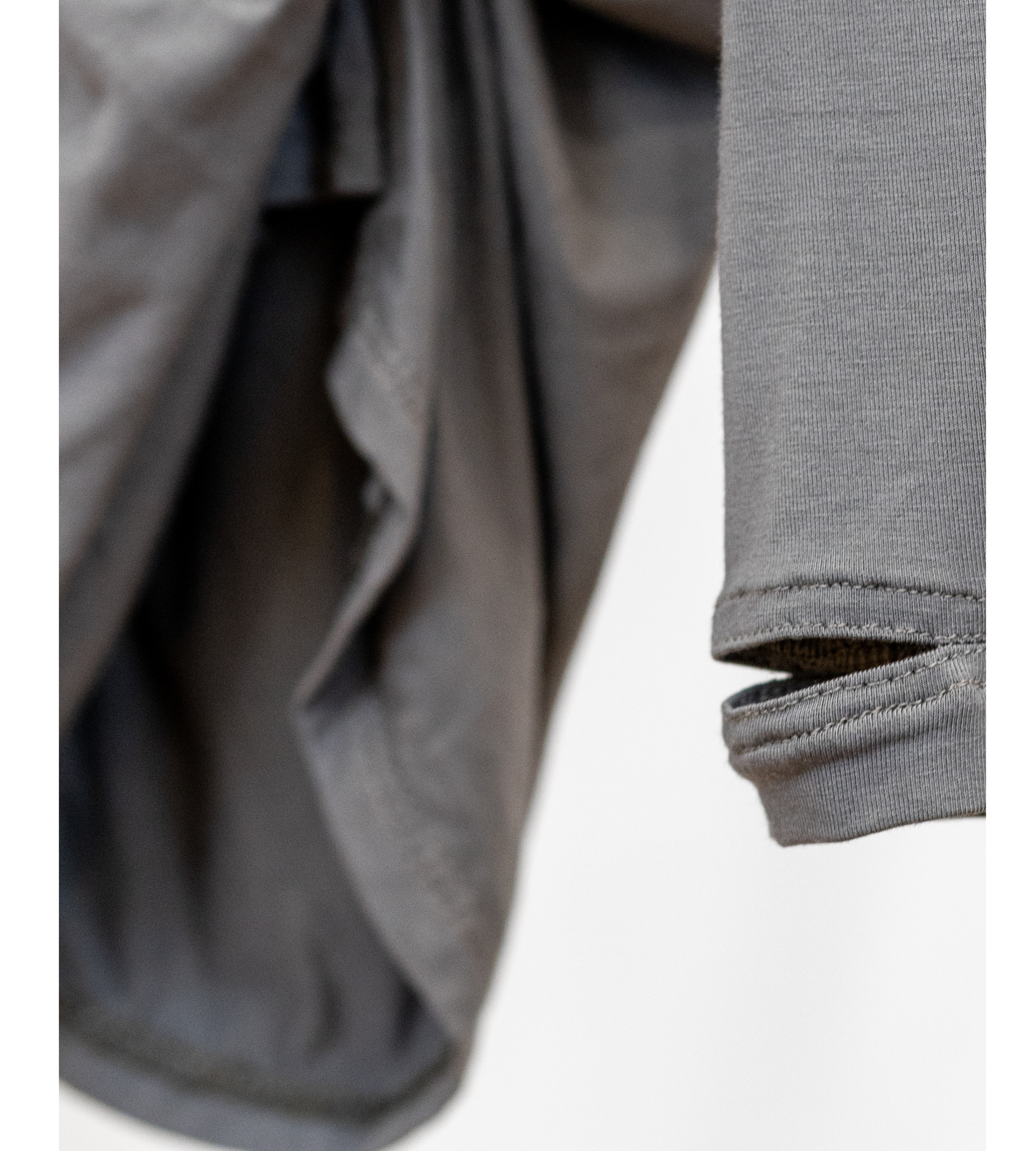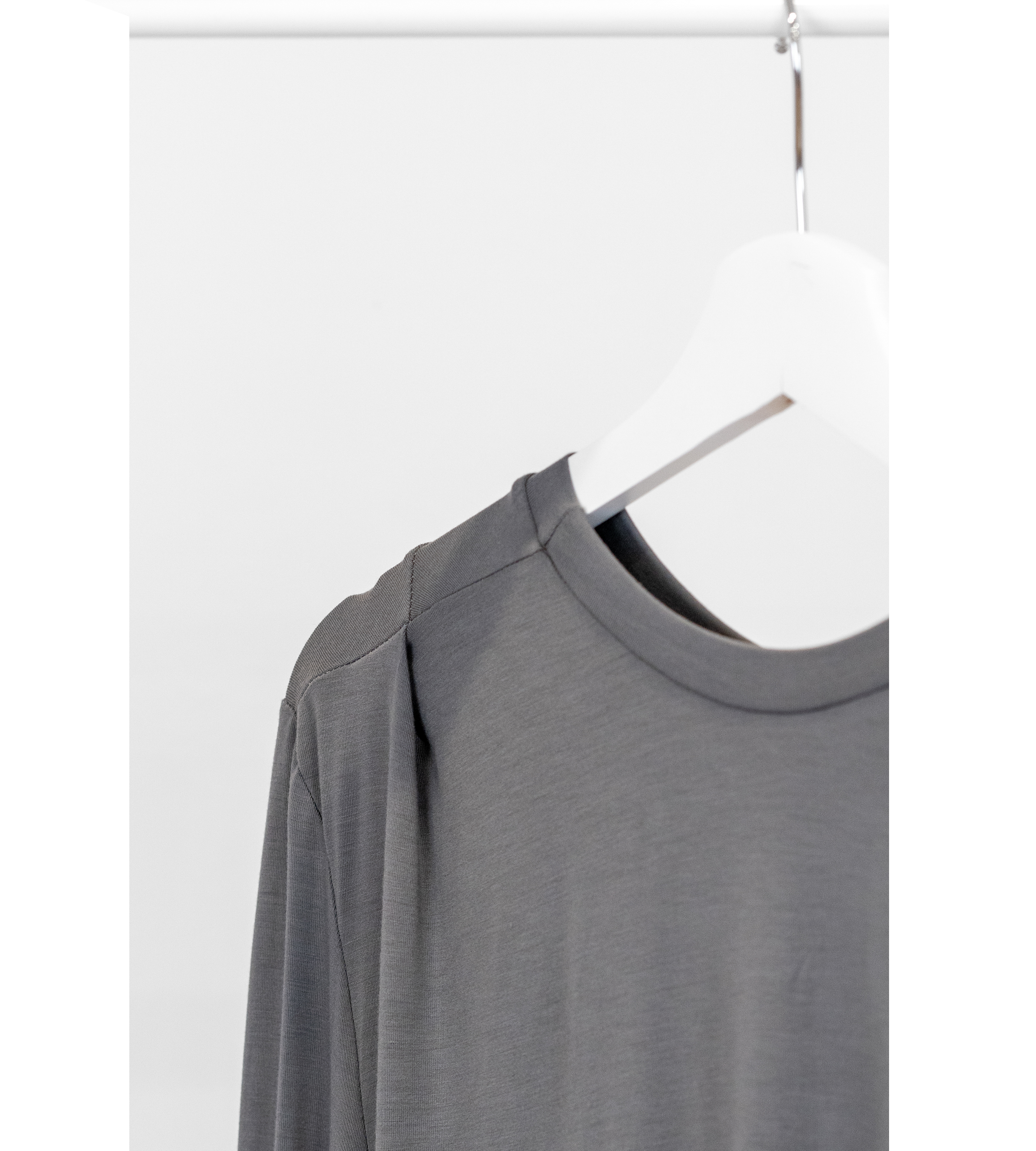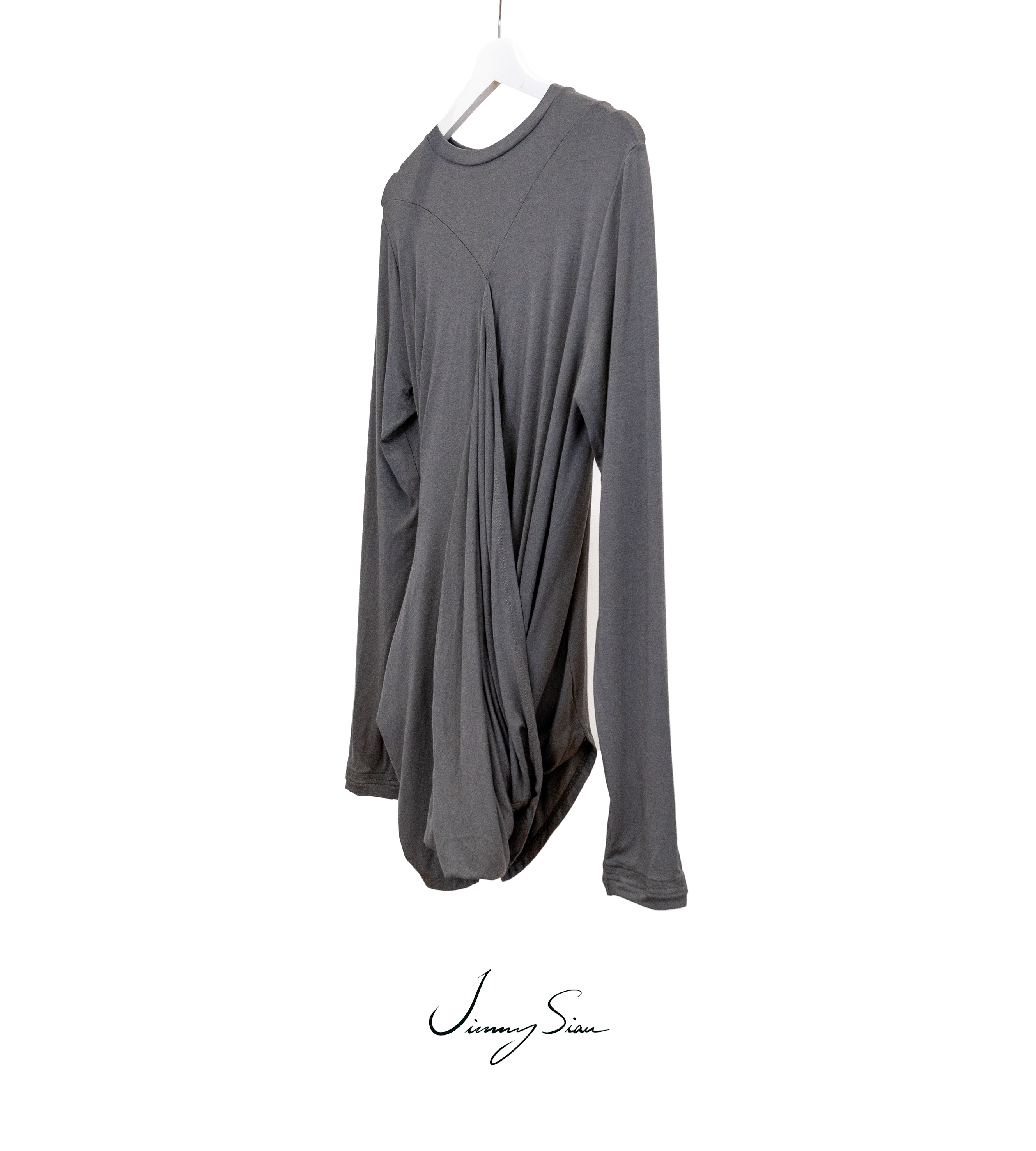 This aw22 hand-draped long-sleeved T-shirt is below hip length. It has a round neck and thumb holes. It features an asymmetric drape running diagonally across the body from the shoulder to the hip and up the back.