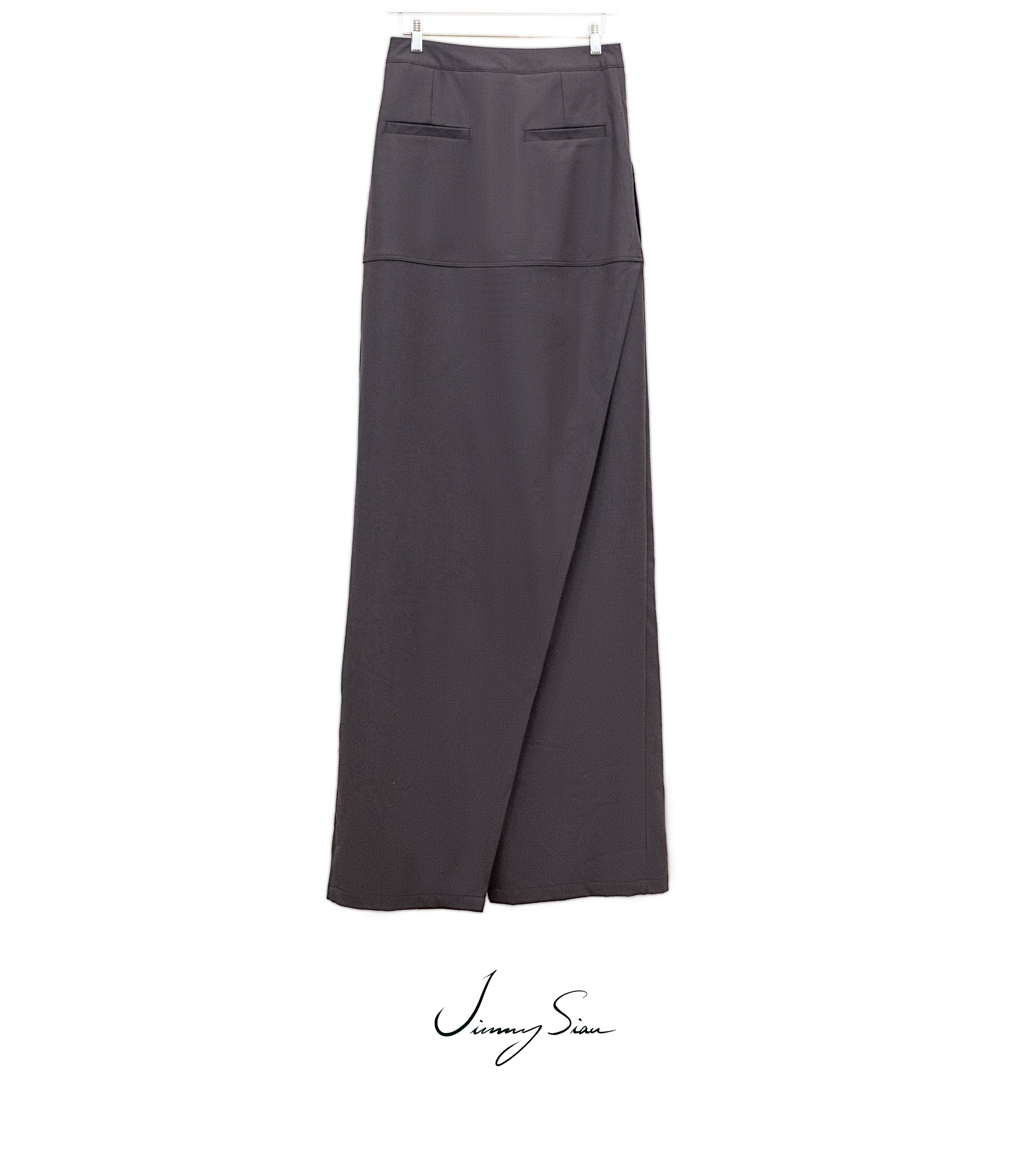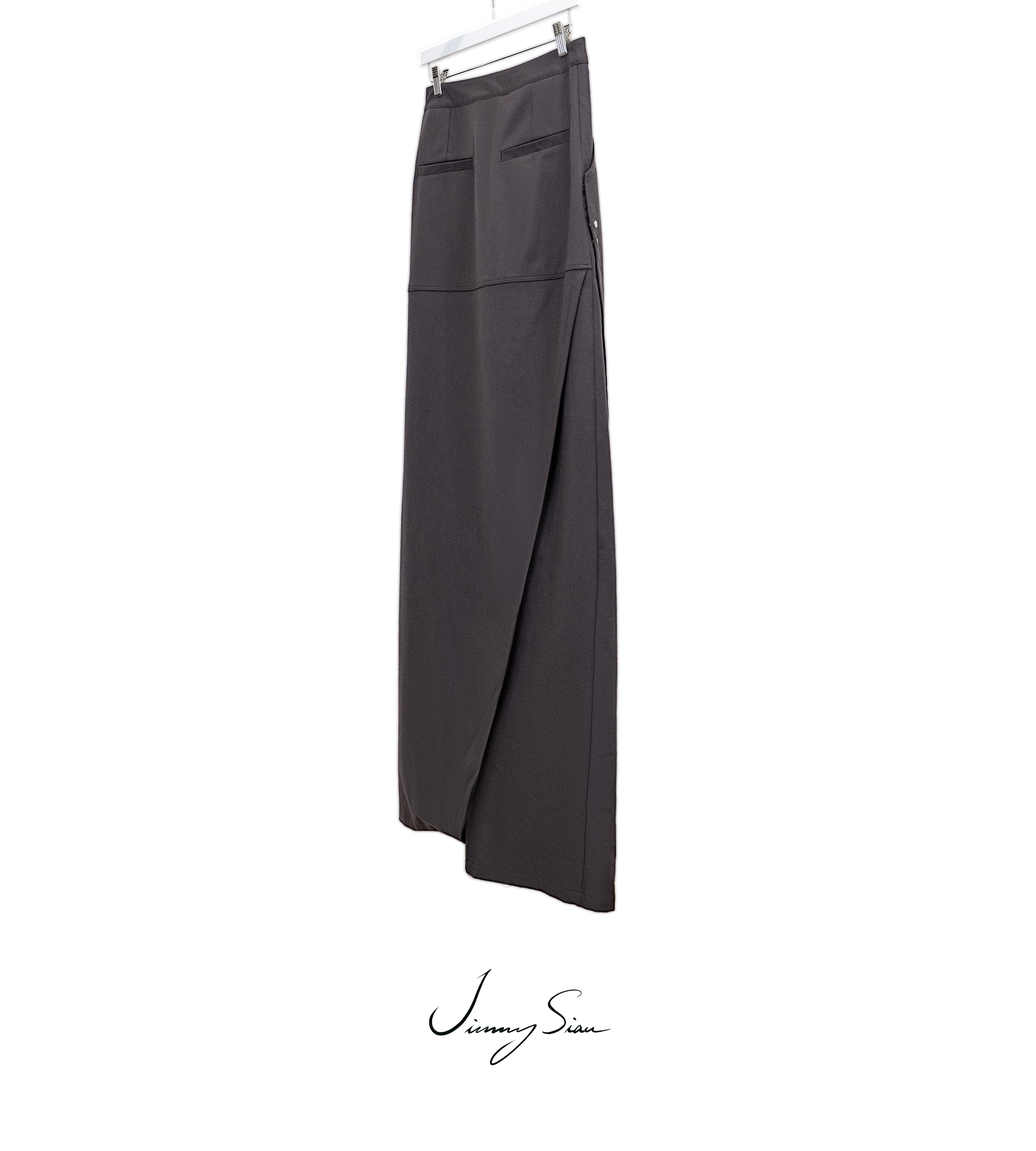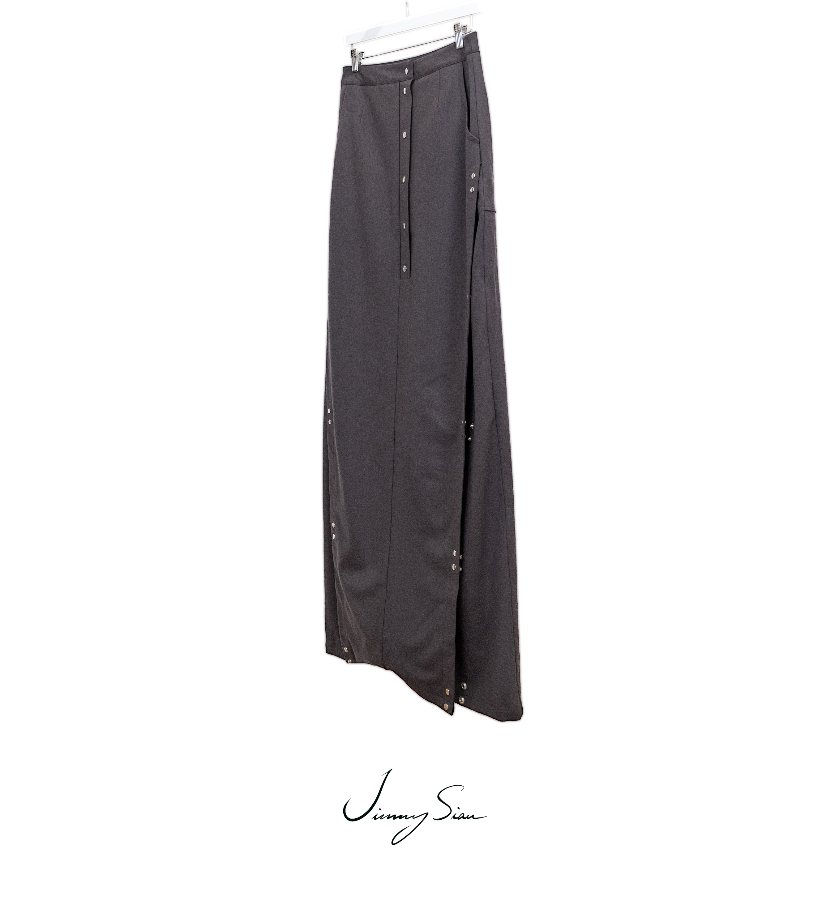 This aw22 maxi skirt has a high-waisted, center front closure with poppers. It features a front flap with poppers and back slit detail. It has two side pockets and two back single welt pockets.