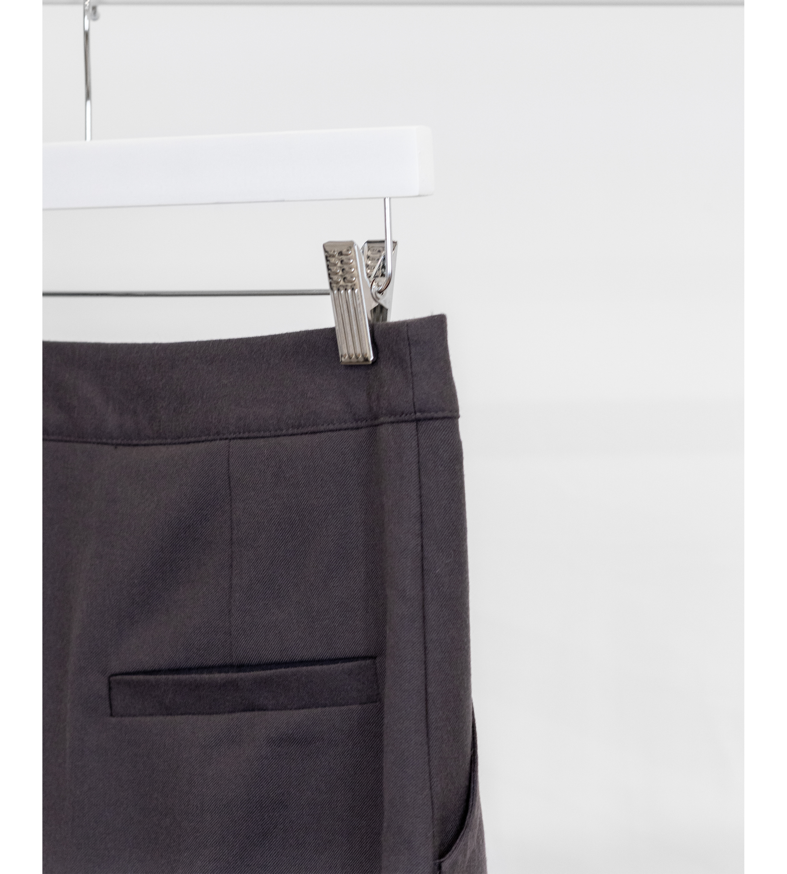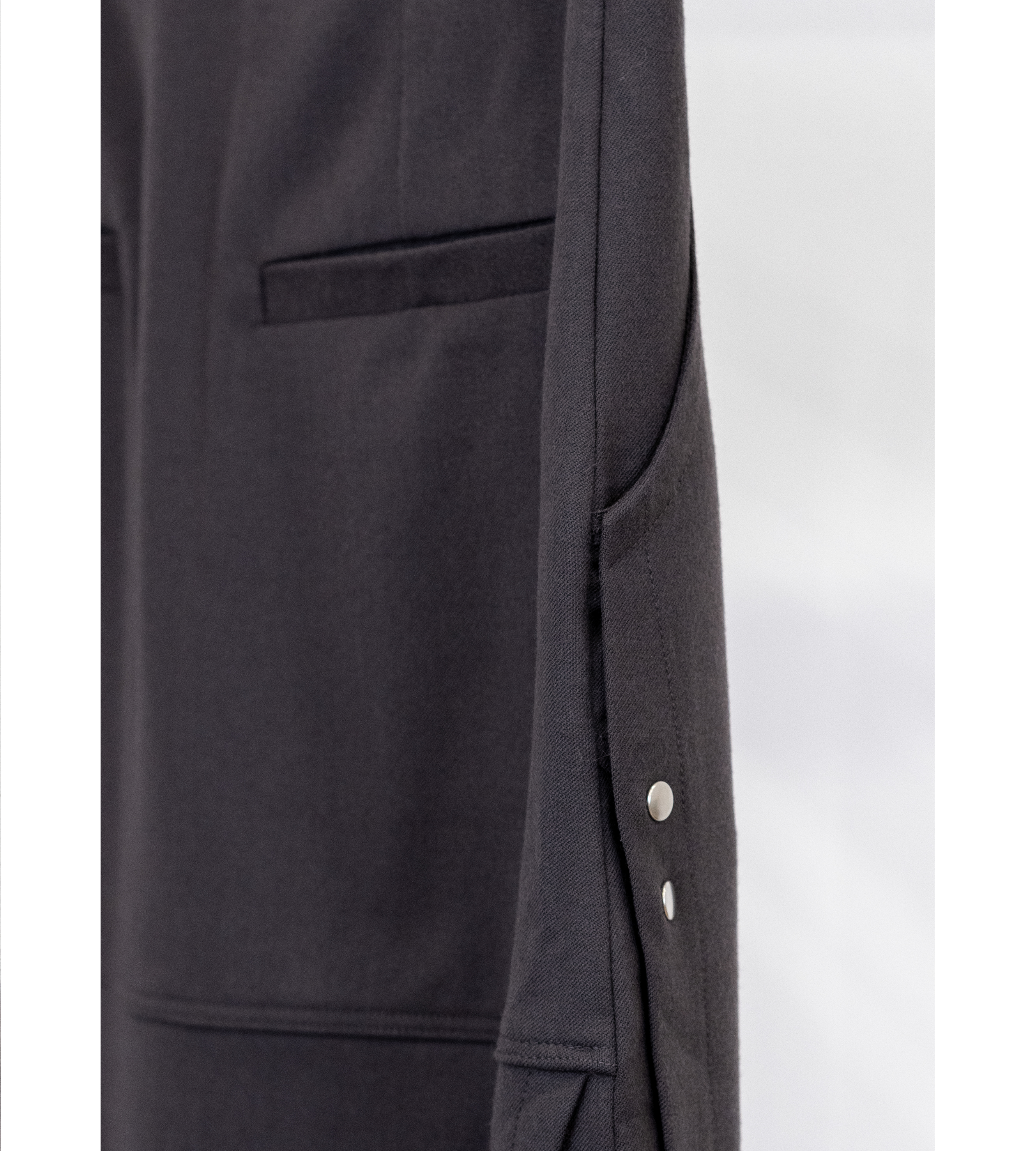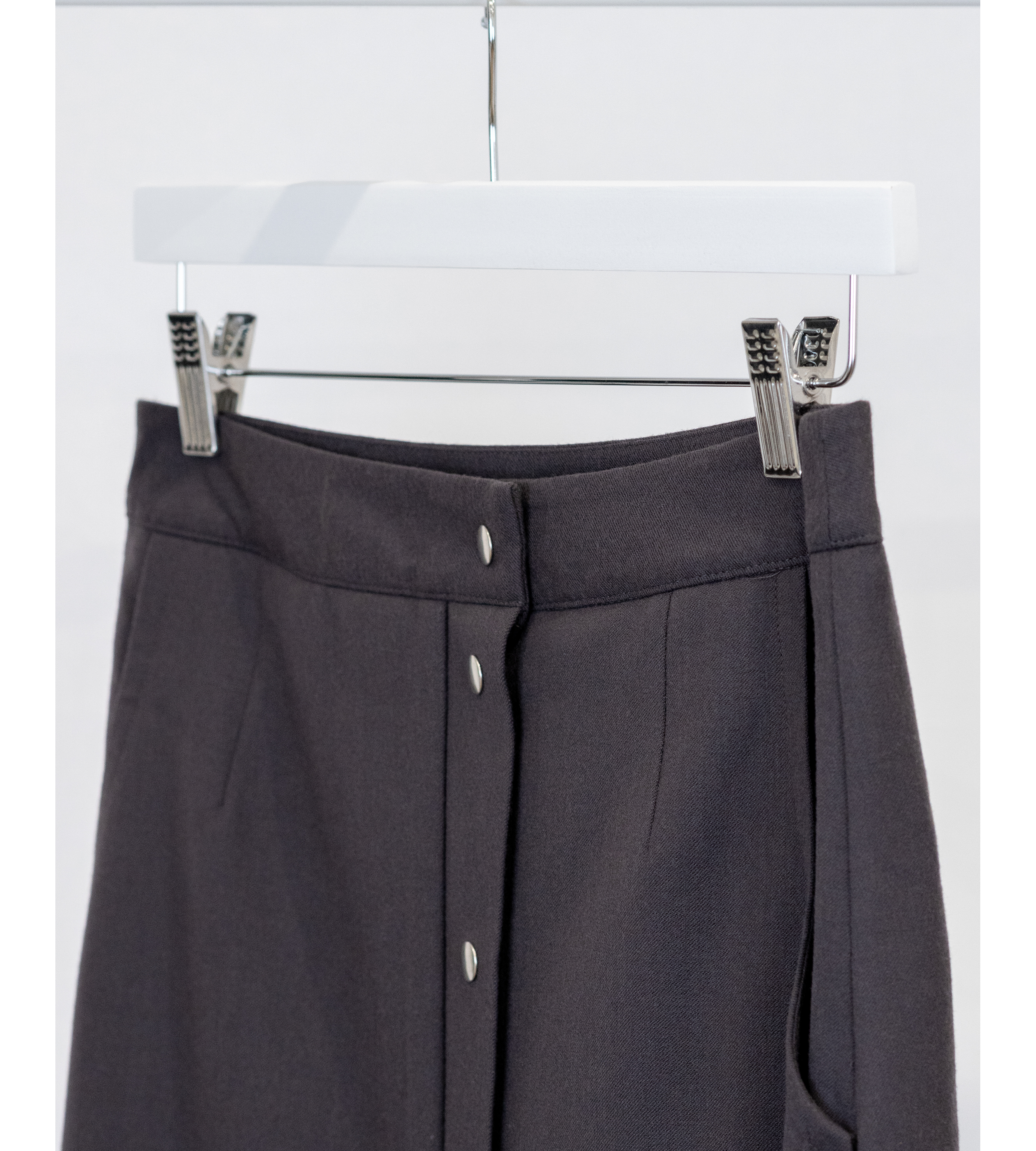 This aw22 maxi skirt has a high-waisted, center front closure with poppers. It features a front flap with poppers and back slit detail. It has two side pockets and two back single welt pockets.