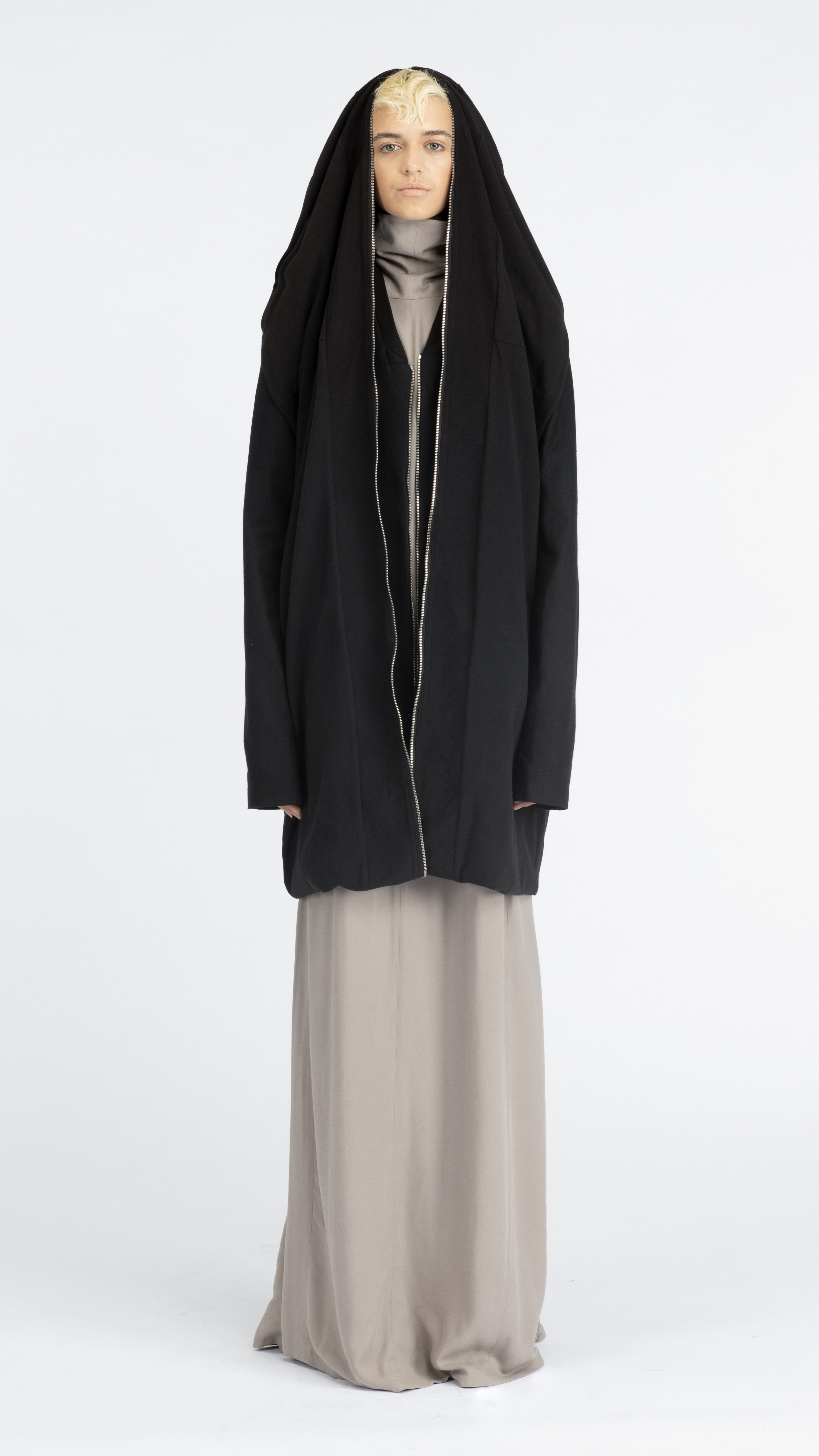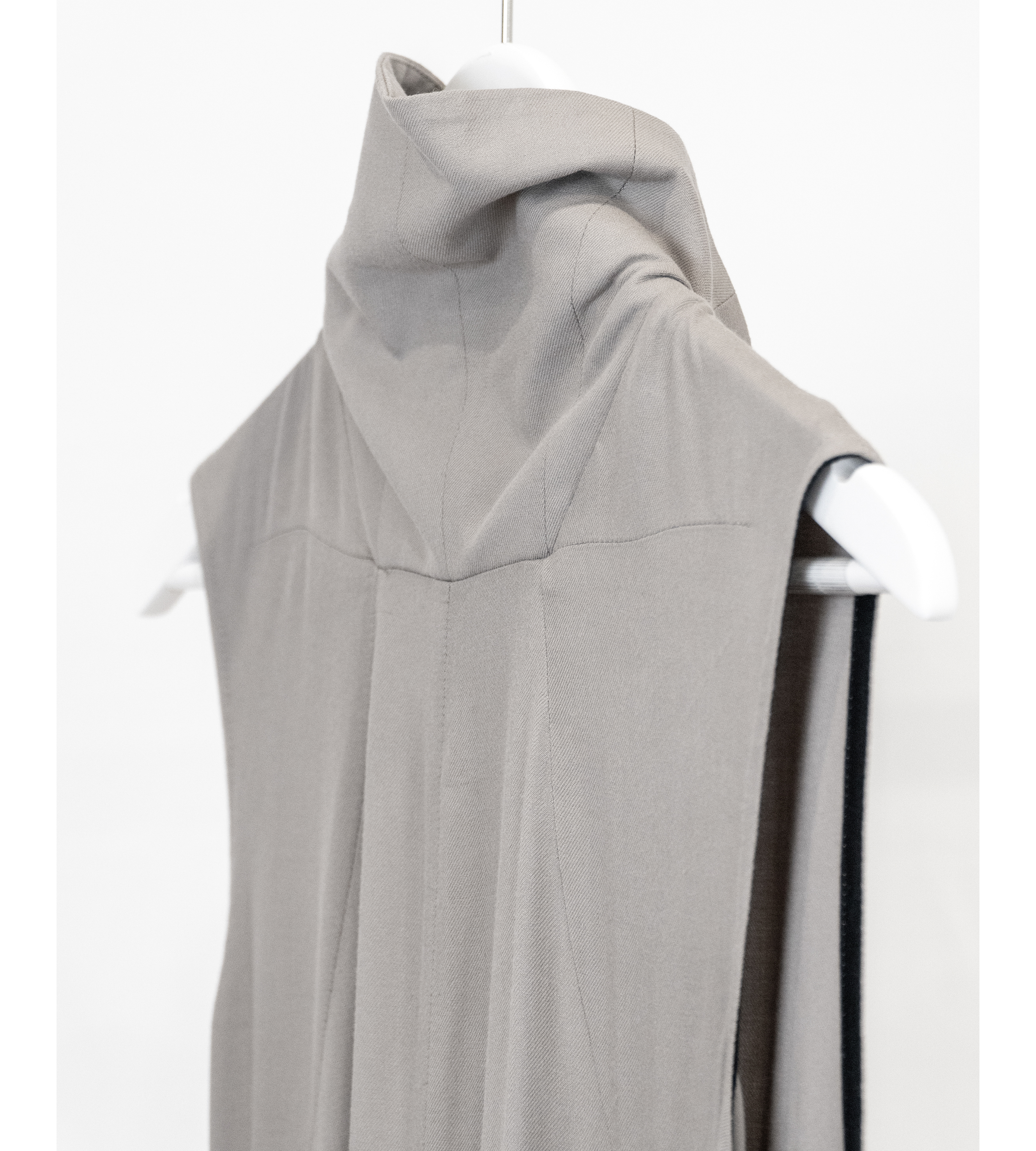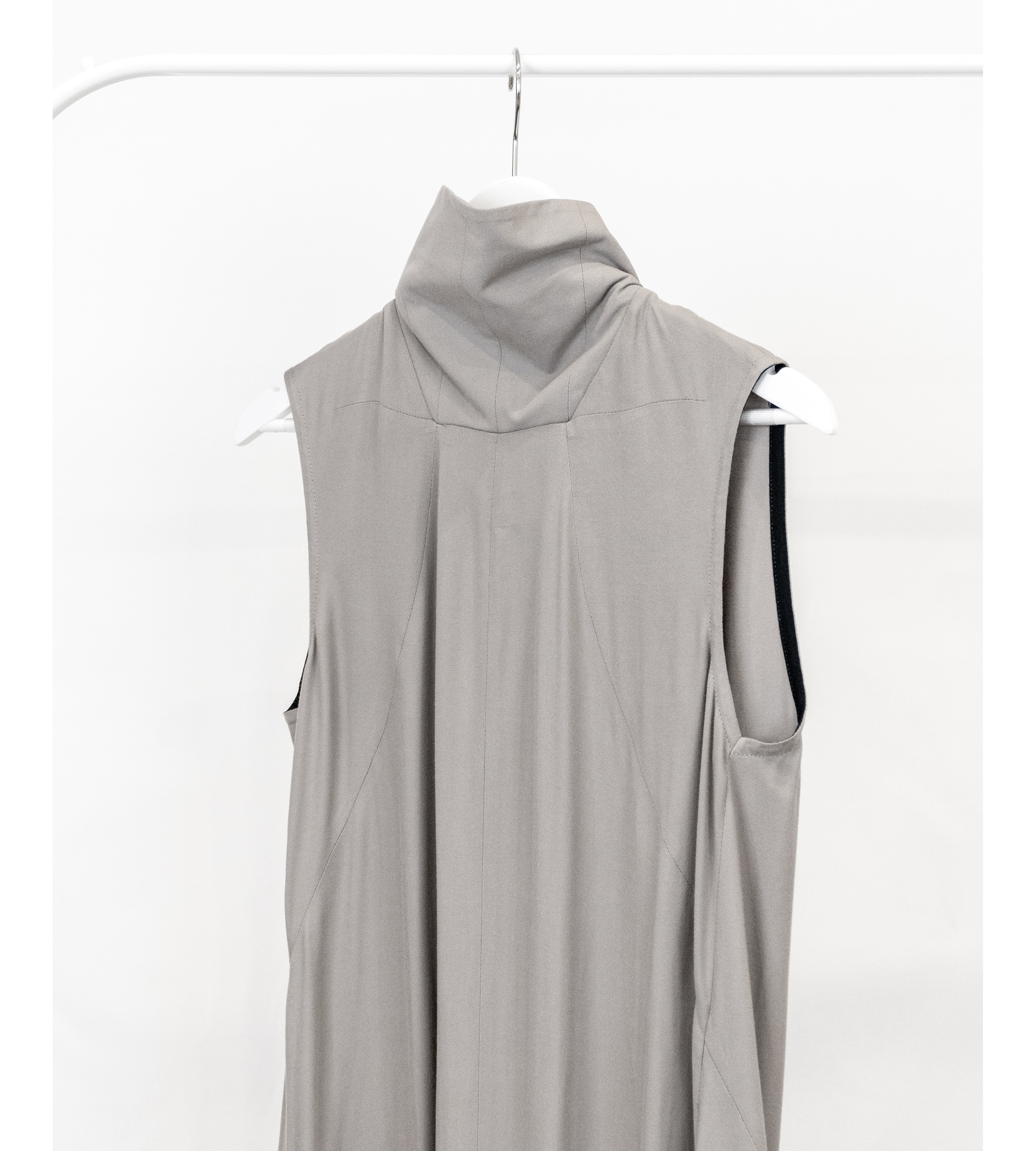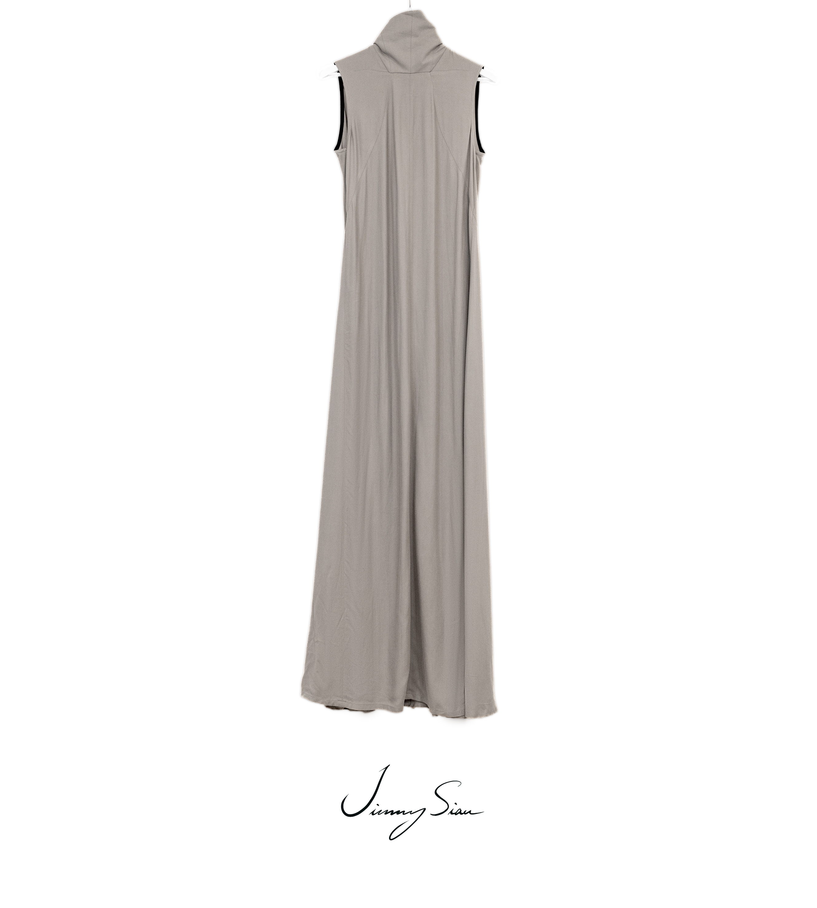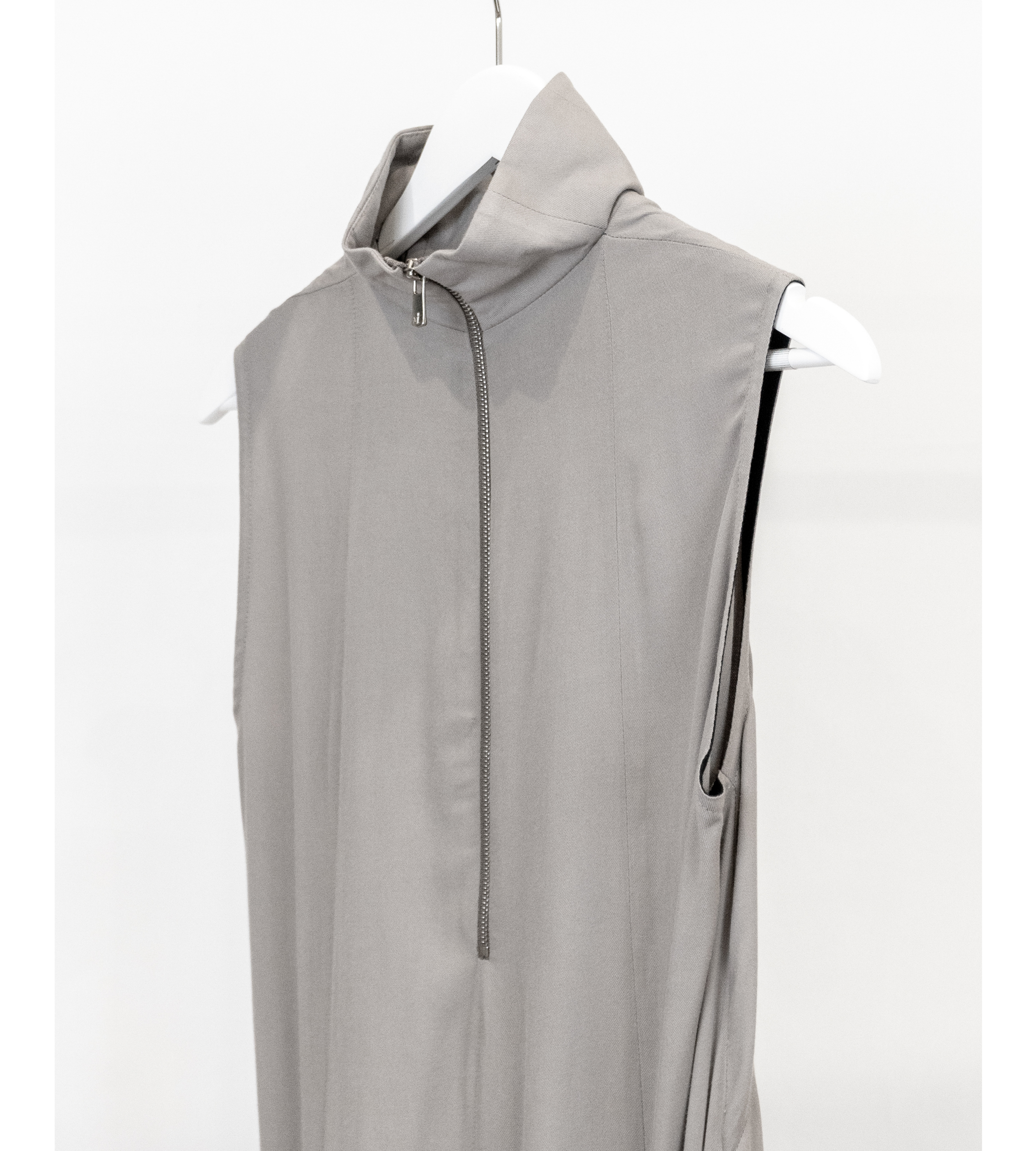 This aw22 maxi dress is floor length with a regular fit. It is a sleeveless dress that features half-zipped closure, longer zippers running from the thigh to the hem, and inner flared panels. It is creatively cut and designed with dart detailing.